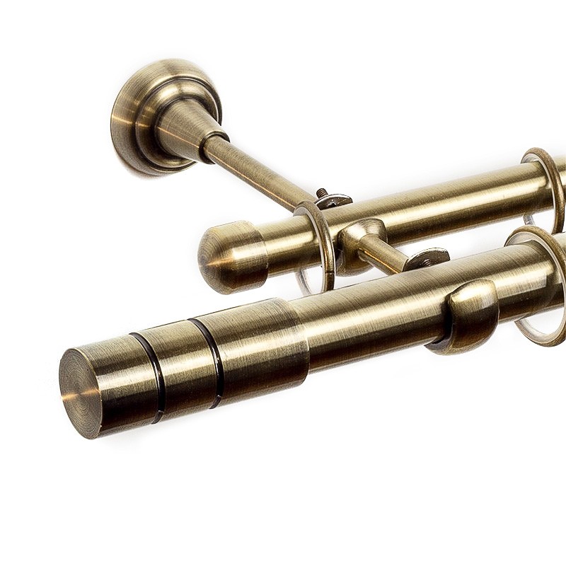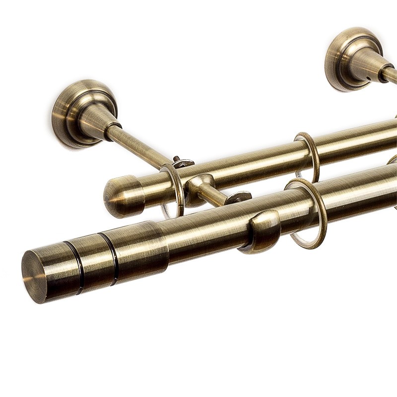 Cylinder – Set complet galerie metalica dubla, culoare Aur Antic, diametrul primei tevi 25 mm, cea din spate 19mm, inele teflonate cu carlige pvc.