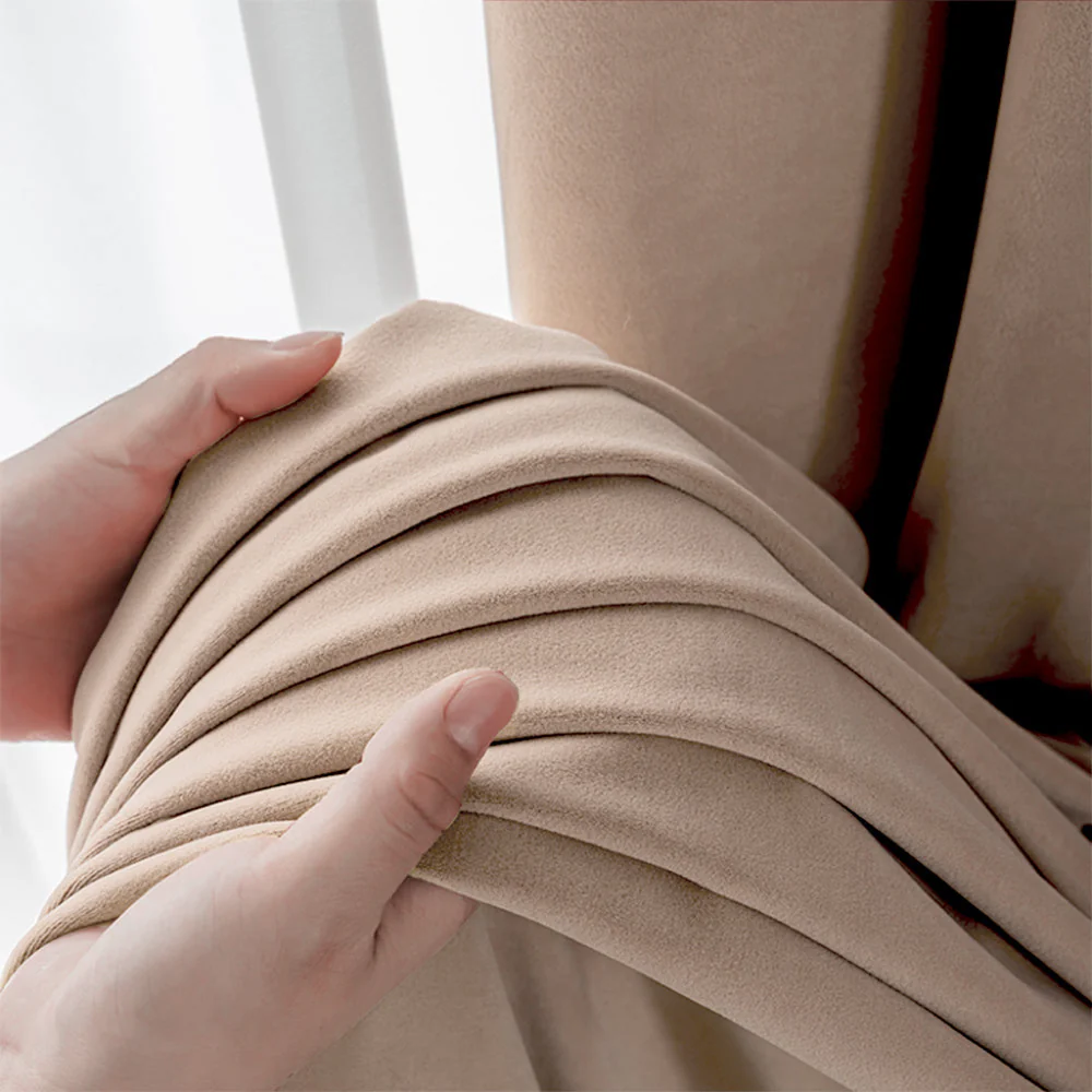 Draperiile de catifea cu textura fluida, placute la atingere, ce nu formeaza cutecu design modern in doua culori, opresc patrunderea luminii solare si au rol termic de a izola fata de temperaturile scazute din anotimpul rece cat si fata de canicula.