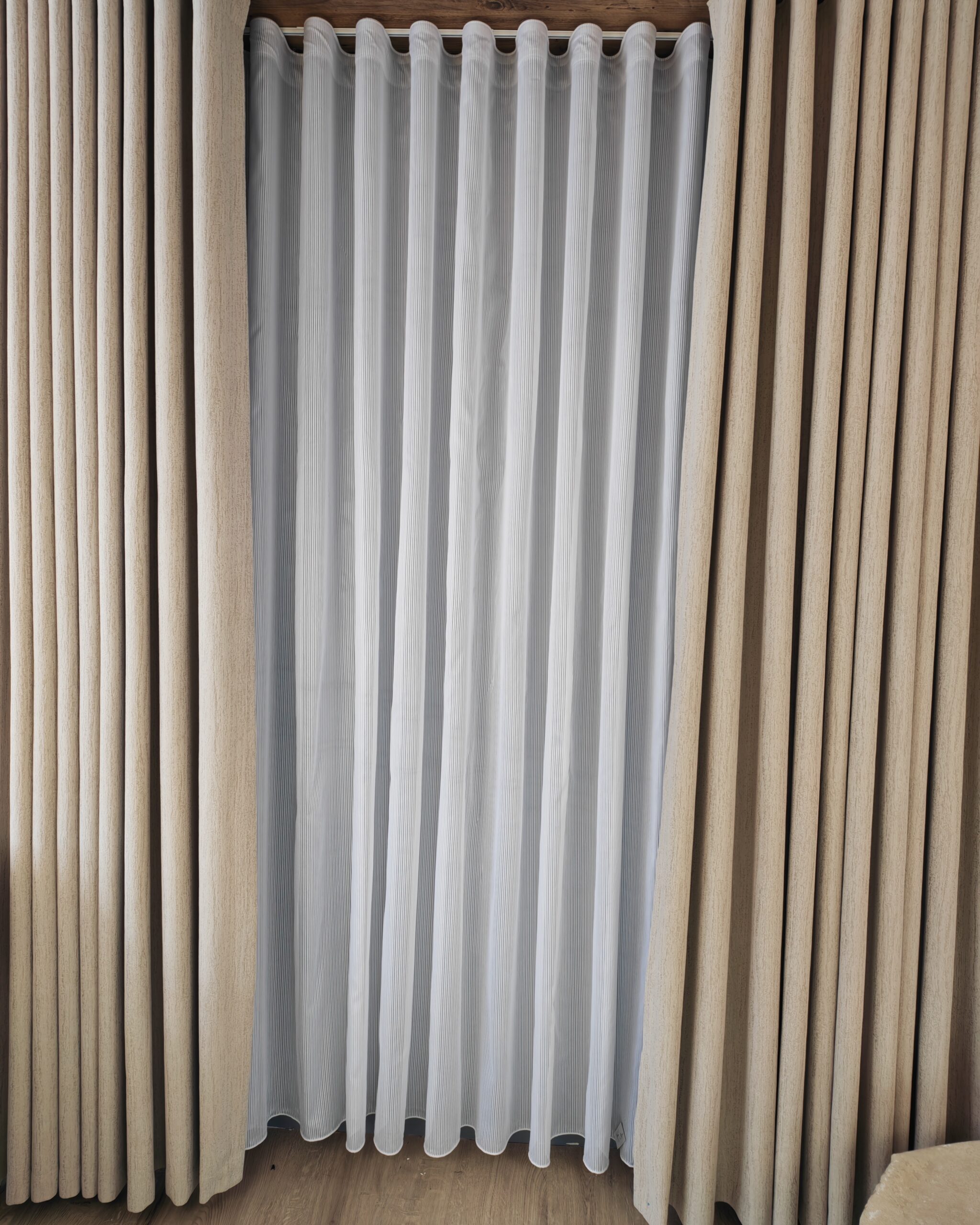 Tesatura de tip voal cu textura de in permite luminii naturale sa intre in interior, pentru un efect stralucitor si incantator. Perdeaua va da senzatia unei incaperi mai inalte, daca se opteaza pentru o lungime pana la nivelul podelei.