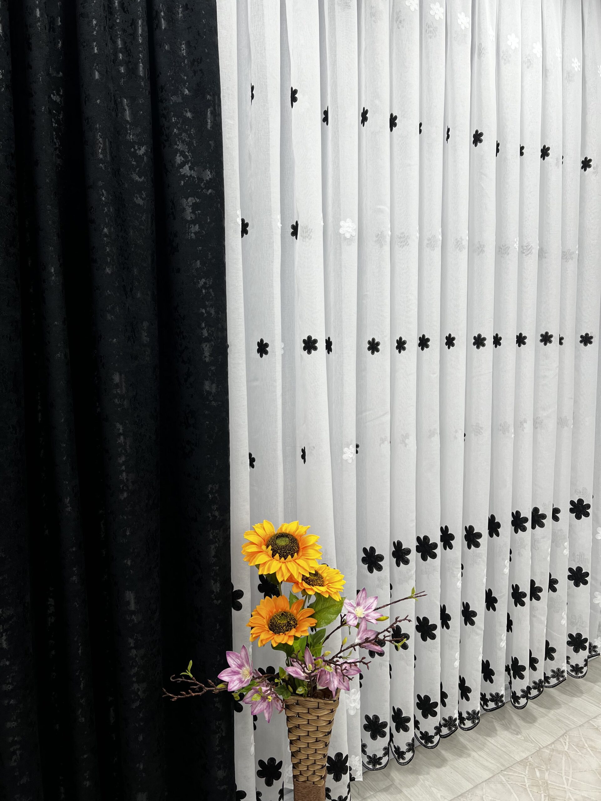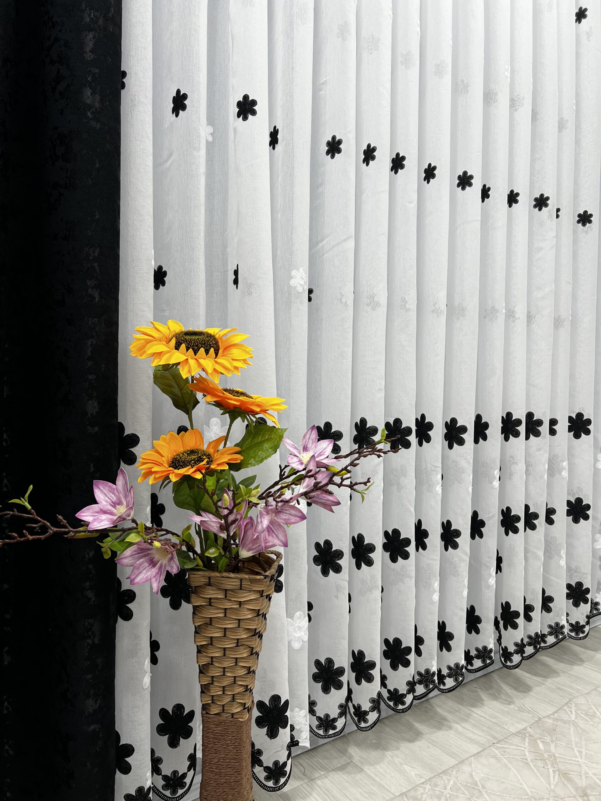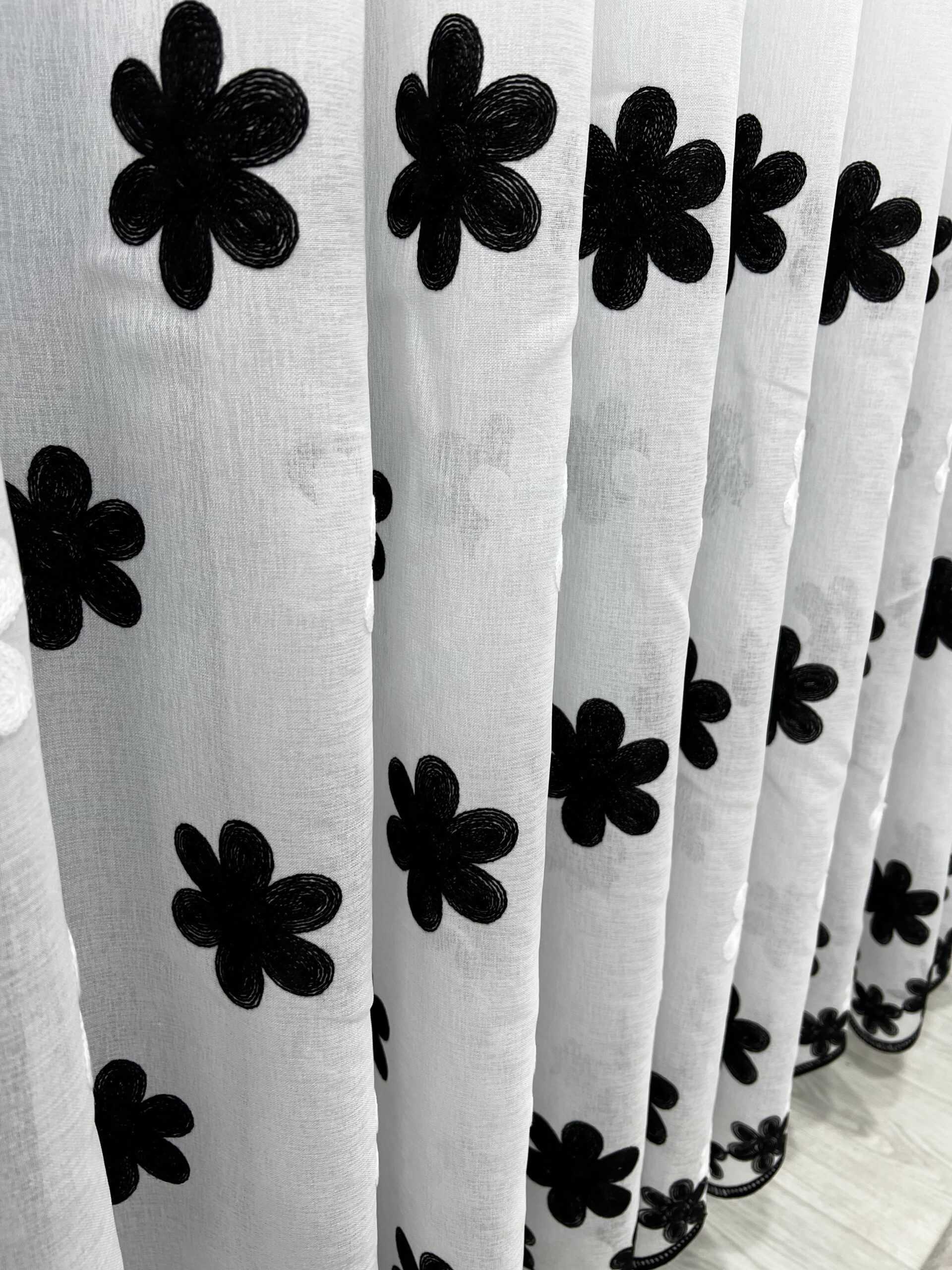 Perdea In cu Brodat Flori Negre L2m/H2m cu Rejansa de 6cm